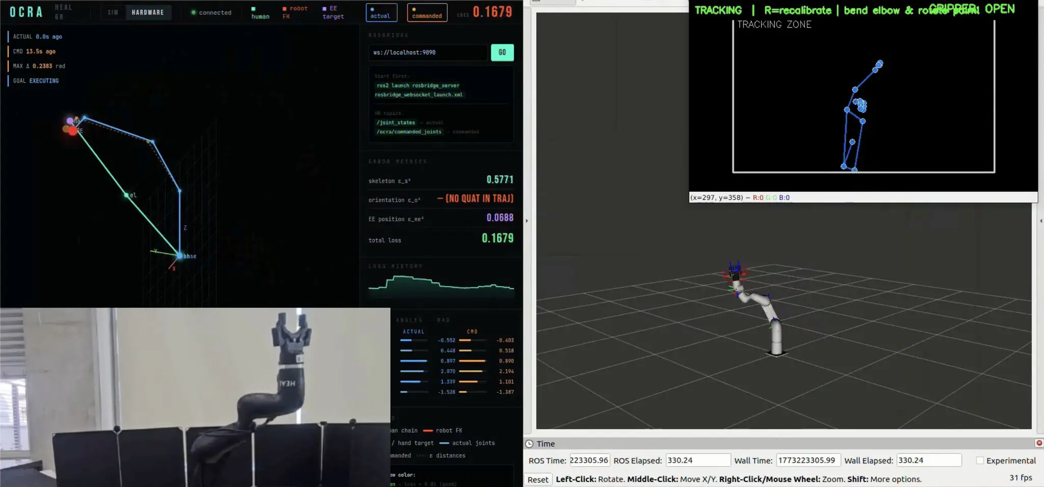 • Output: 3D joint positions of the human arm, streamed via ROS